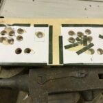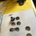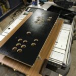 In die Platte für das Controlpanel werden die Löcher für die Buttons und Joysticks gebohrt (30mm Durchmesser). Hierzu haben wir die ausgedruckte Schablone aus dem zweiten Teil des DIY mit Klebeband aufgebracht. Damit die Buttons direkt angebracht werden können, haben wir das lackieren des Controlboards vorgezogen.