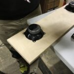 In die Querplatte über dem Display müssen nun noch die Aussparungen für die Lautsprecher eingefräst und die Lautsprecher angebracht werden. Außerdem haben wir Löcher für die Stromversorgung und kleine Metallplatten in das Holz gefräst, in die später USB, LAN und Audioanschlüsse eingelassen werden.