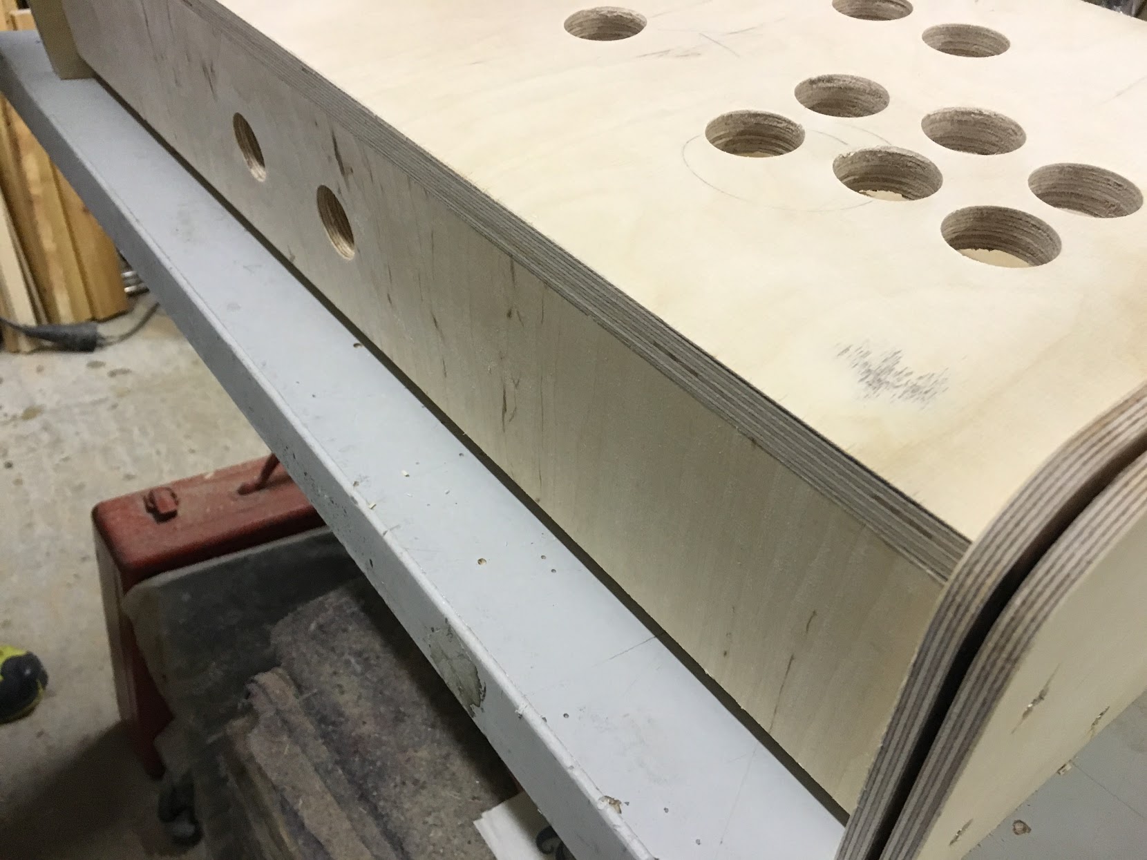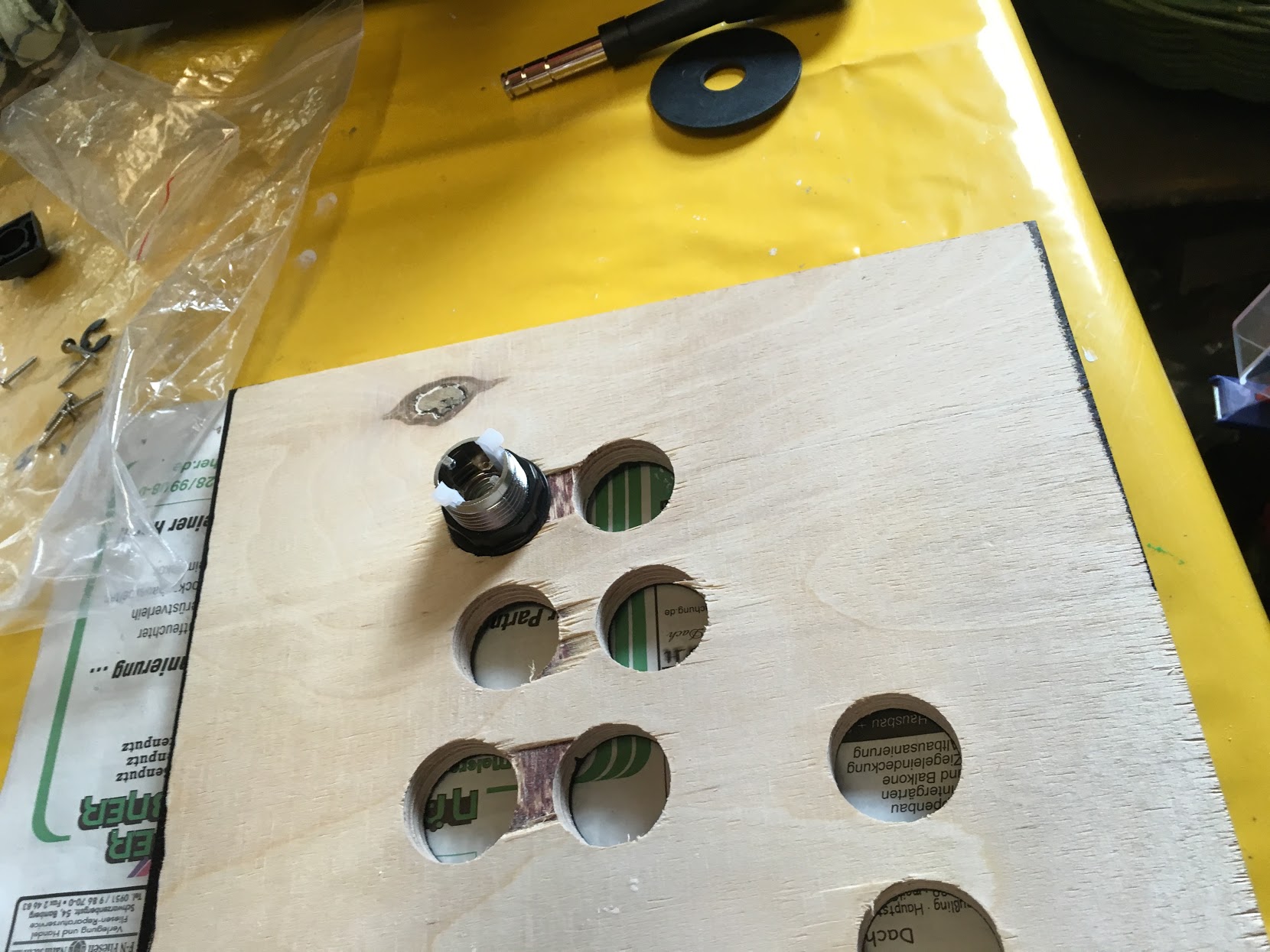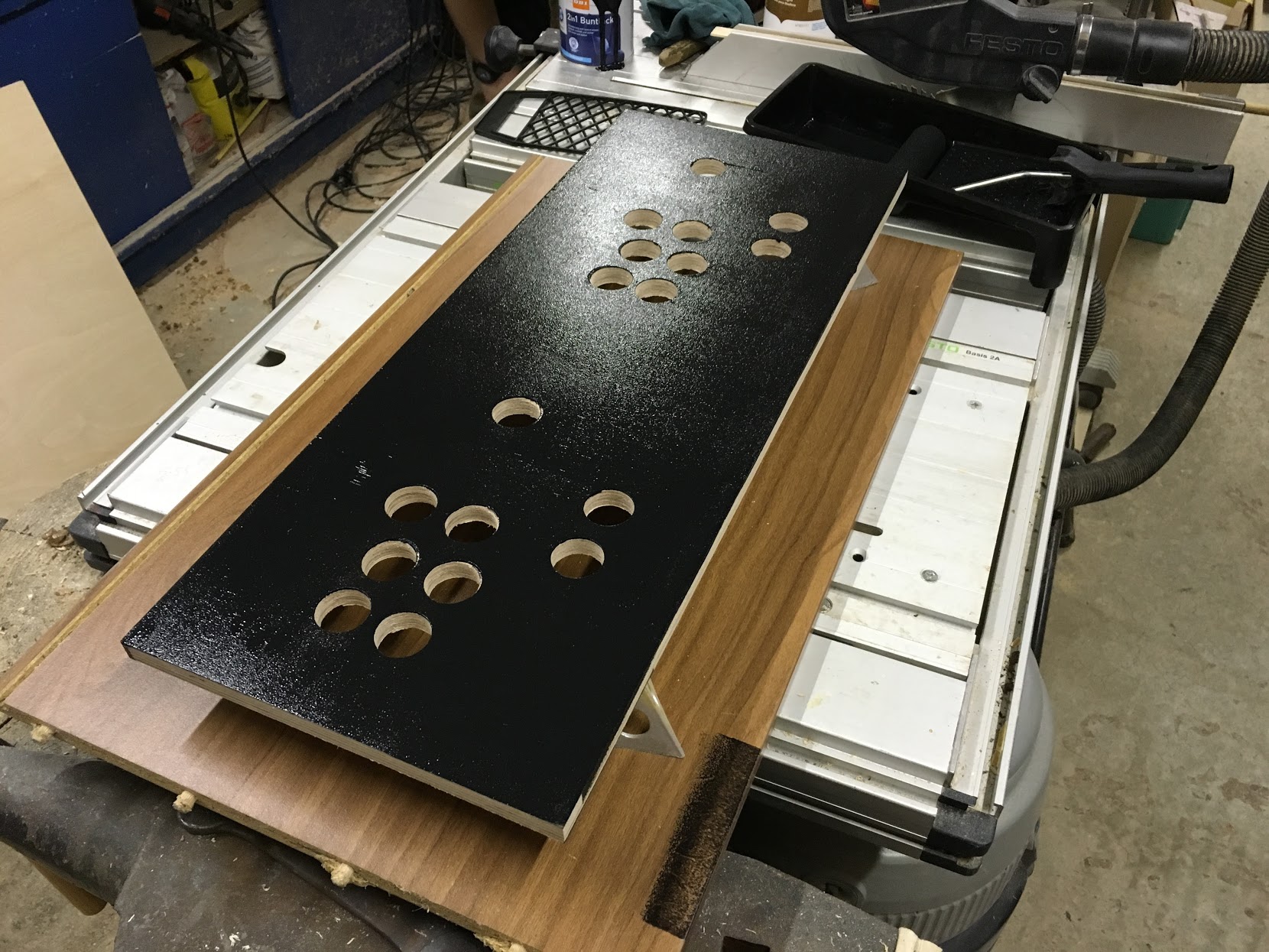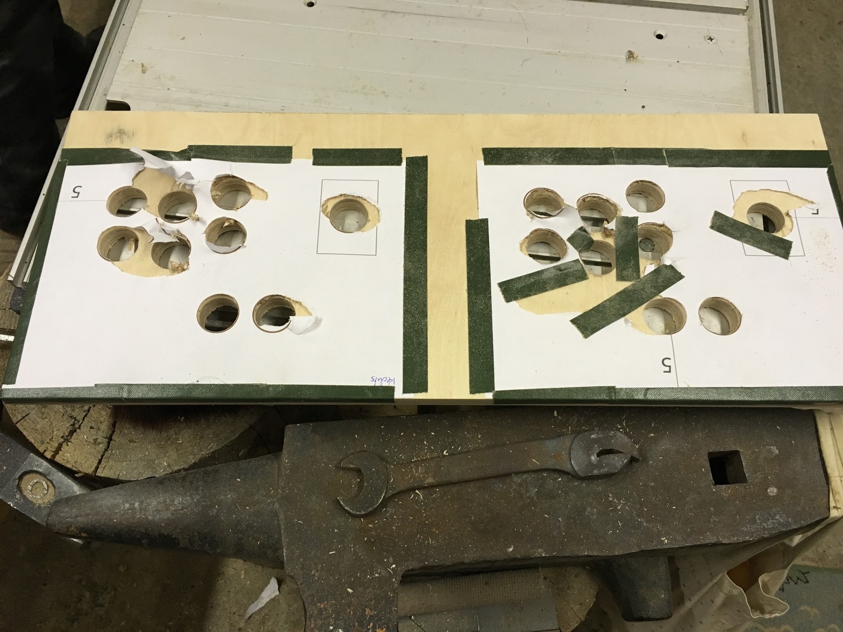 In die Platte für das Controlpanel werden die Löcher für die Buttons und Joysticks gebohrt (30mm Durchmesser). Hierzu haben wir die ausgedruckte Schablone aus dem zweiten Teil des DIY mit Klebeband aufgebracht. Damit die Buttons direkt angebracht werden können, haben wir das lackieren des Controlboards vorgezogen.