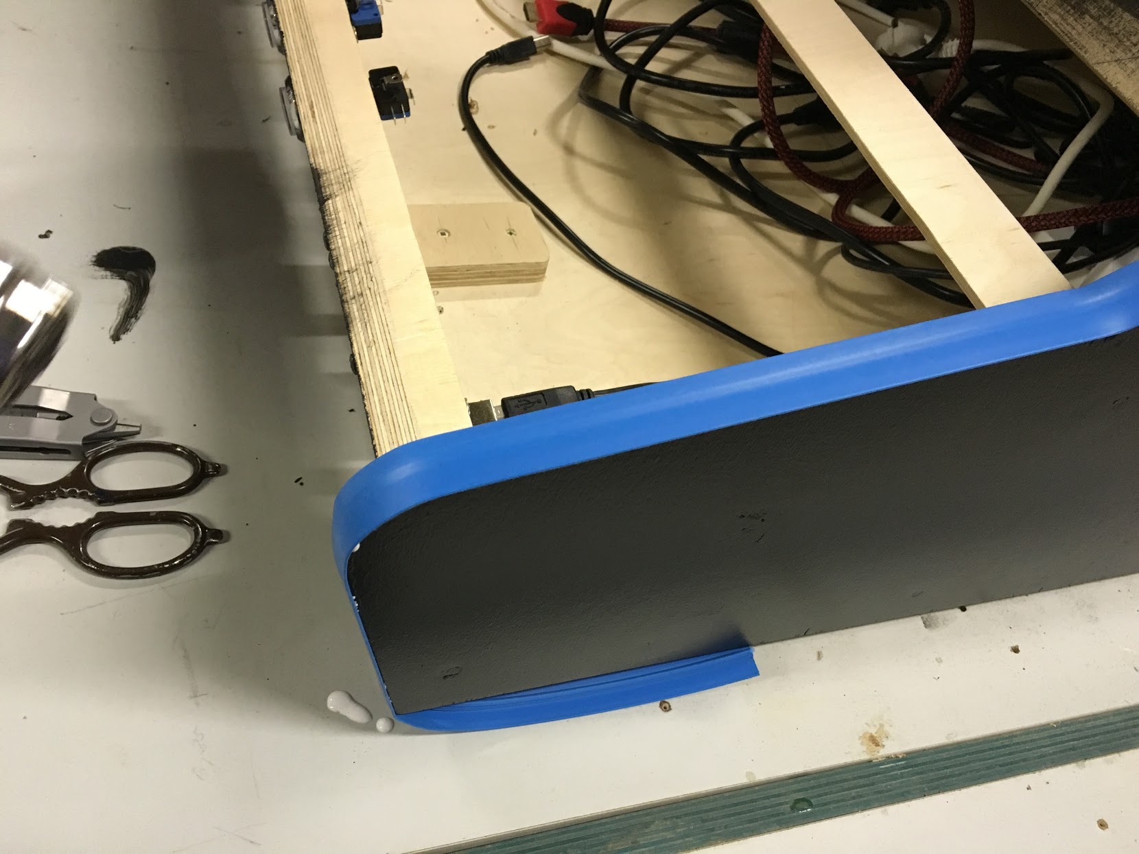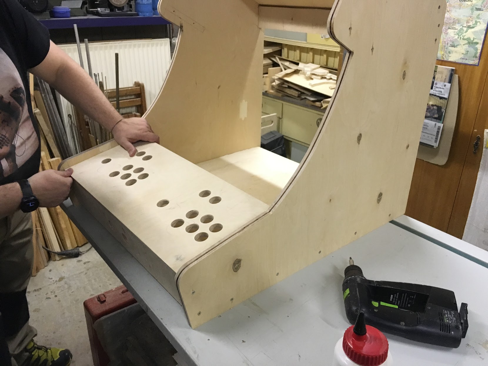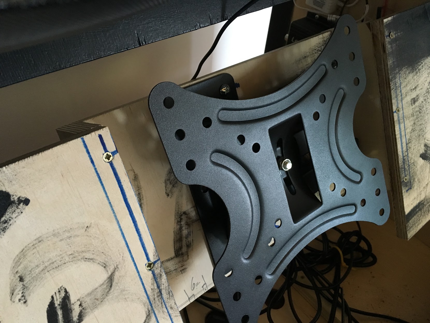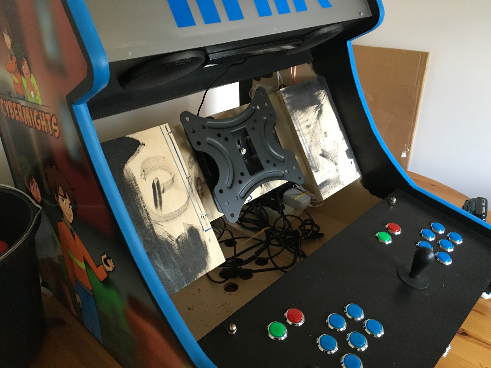 Nach einigen Tagen in Benutzung haben wir festgestellt, dass der Winkel des Monitors nicht ganz optimal ist, und sich ein kleiner Spalt zwischen Monitor und Controlboard ergeben hat. Hierfür hatten wir die Idee im Inneren des Gehäuses eine Monitorwandhalterung anzubringen, über die wir den Winkel und die genaue Position bestimmen können. Das war erheblich aufwändiger, als es klingt, hat am Ende aber funktioniert.