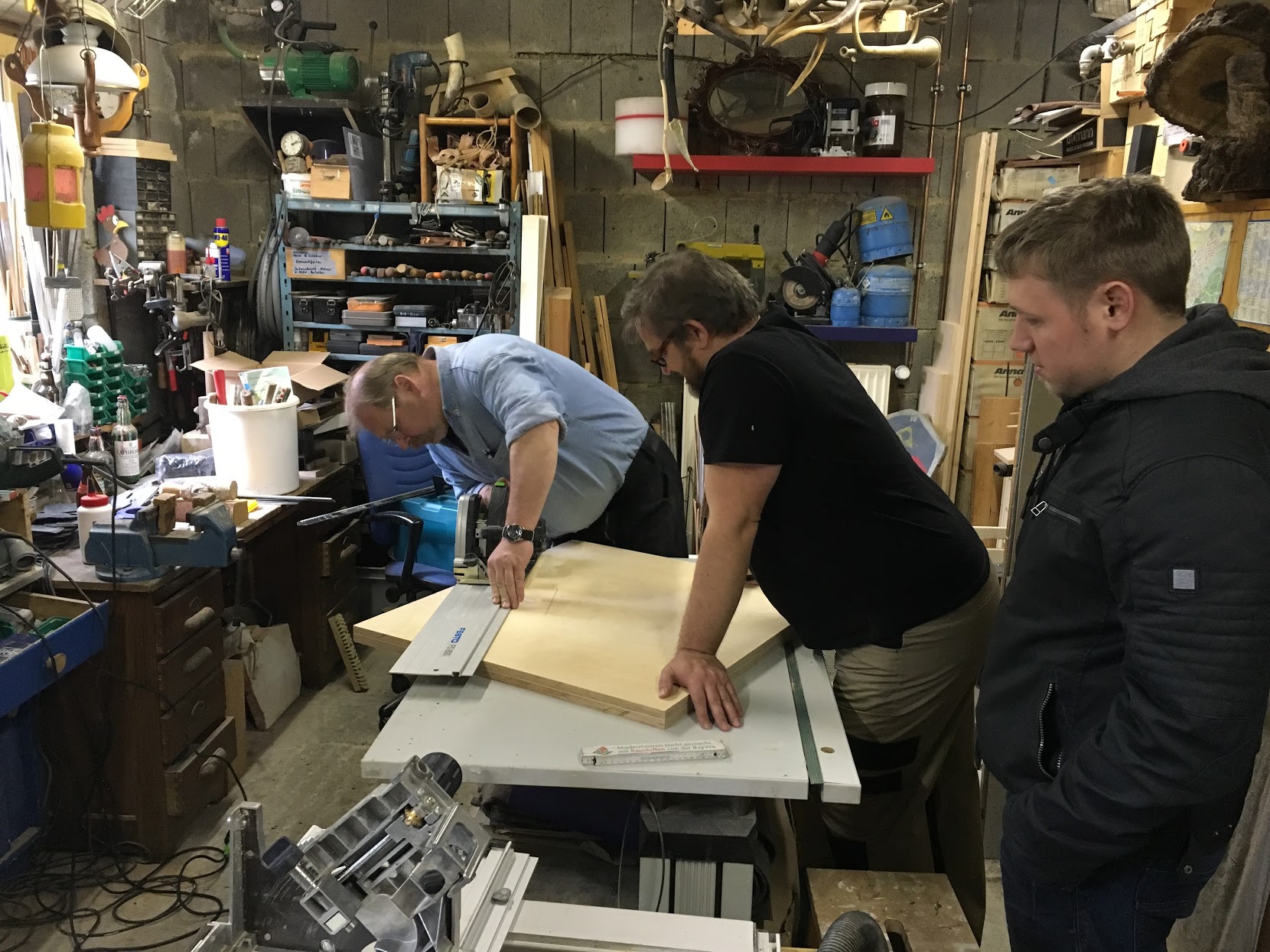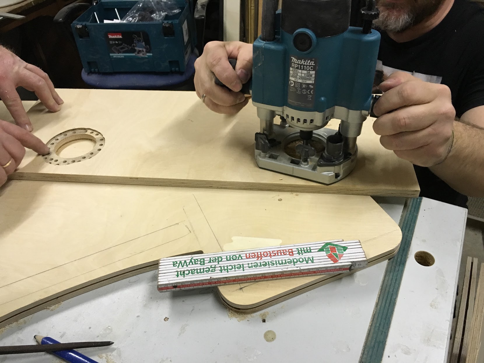 Da wir später eine Stegkante (auch T-Molding genannt) an den Kanten anbringen möchten, haben wir mit der Oberfräse 5mm dicke Schlitze komplett außen herum eingefräst.