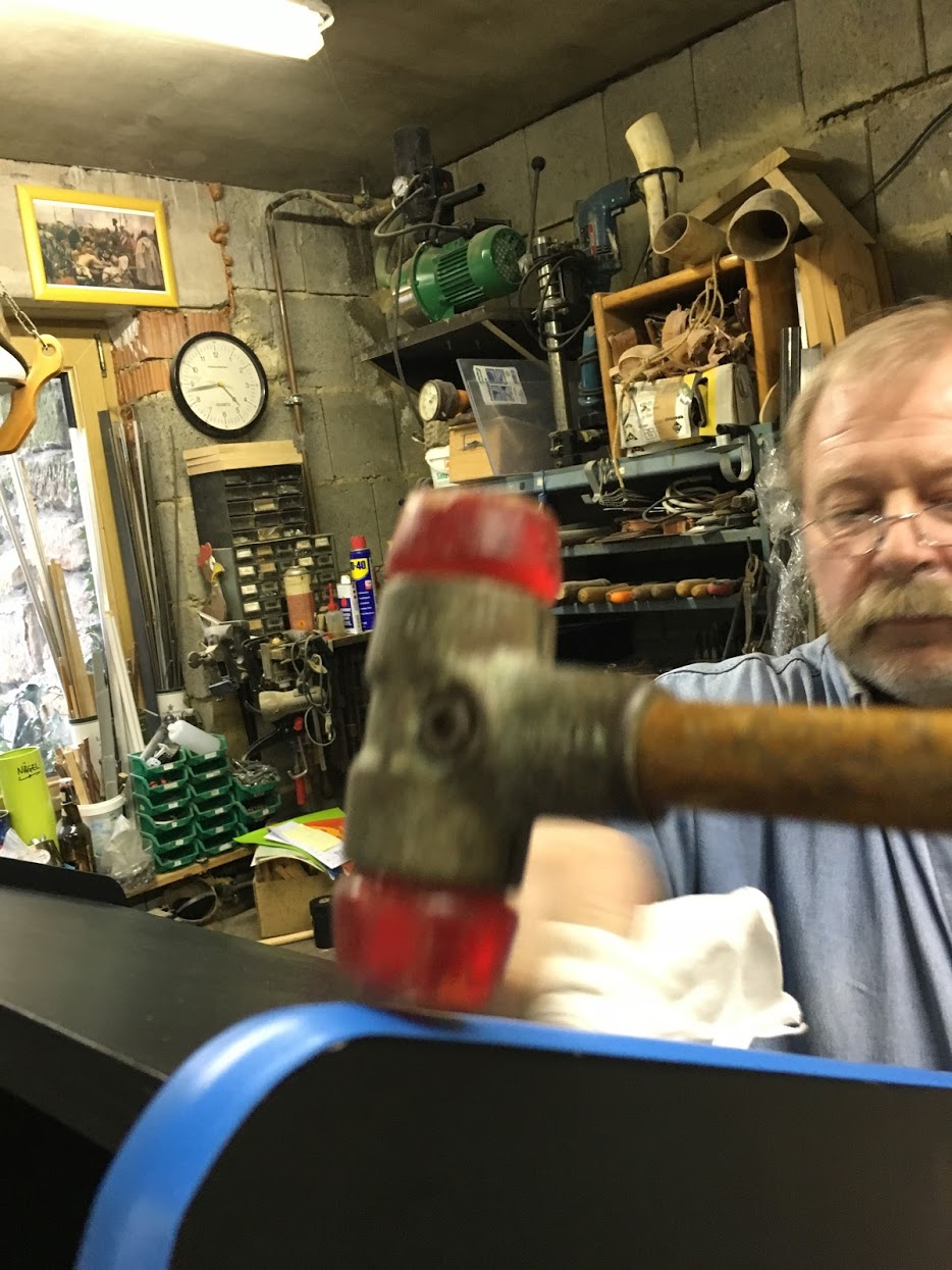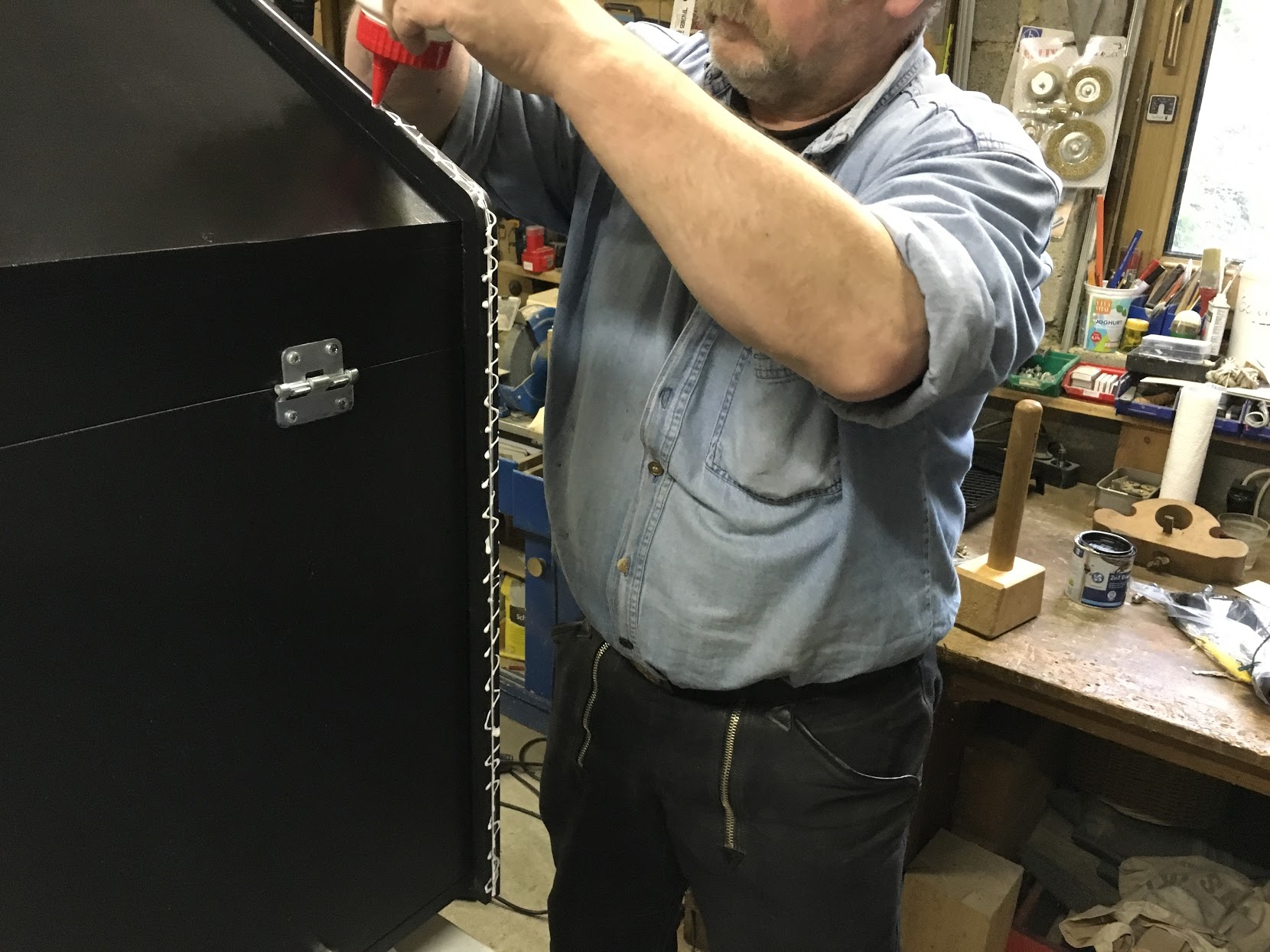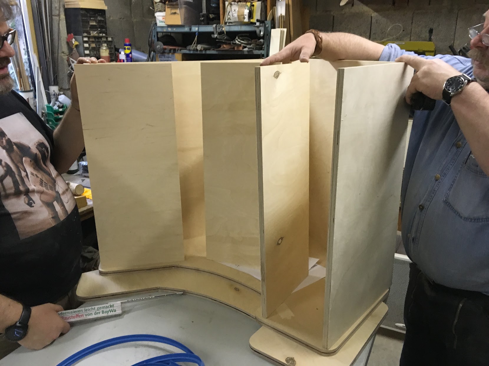 In den folgenden Tagen und Wochen haben wir dann noch einige Feinarbeiten und Korrekturen vorgenommen. Angefangen haben wir selbstverständlich mit dem Lackieren des restlichen Gehäuses. Nachdem der Lack getrocknet war, konnten wir mit einem kleinen Gummihammer und einem Föhn die Stegkanten an den Schlitzen in die Seitenwände anbringen. Der Föhn wird dringend benötigt um die Stegkante etwas aufzuweichen und an die Rundungen anpassen zu können.