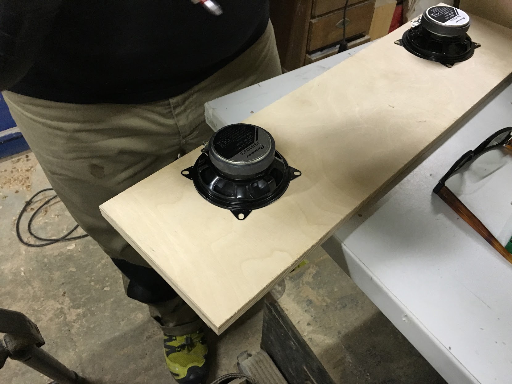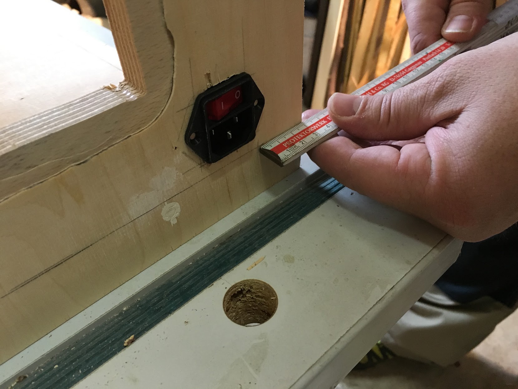 In die Querplatte über dem Display müssen nun noch die Aussparungen für die Lautsprecher eingefräst und die Lautsprecher angebracht werden. Außerdem haben wir Löcher für die Stromversorgung und kleine Metallplatten in das Holz gefräst, in die später USB, LAN und Audioanschlüsse eingelassen werden.