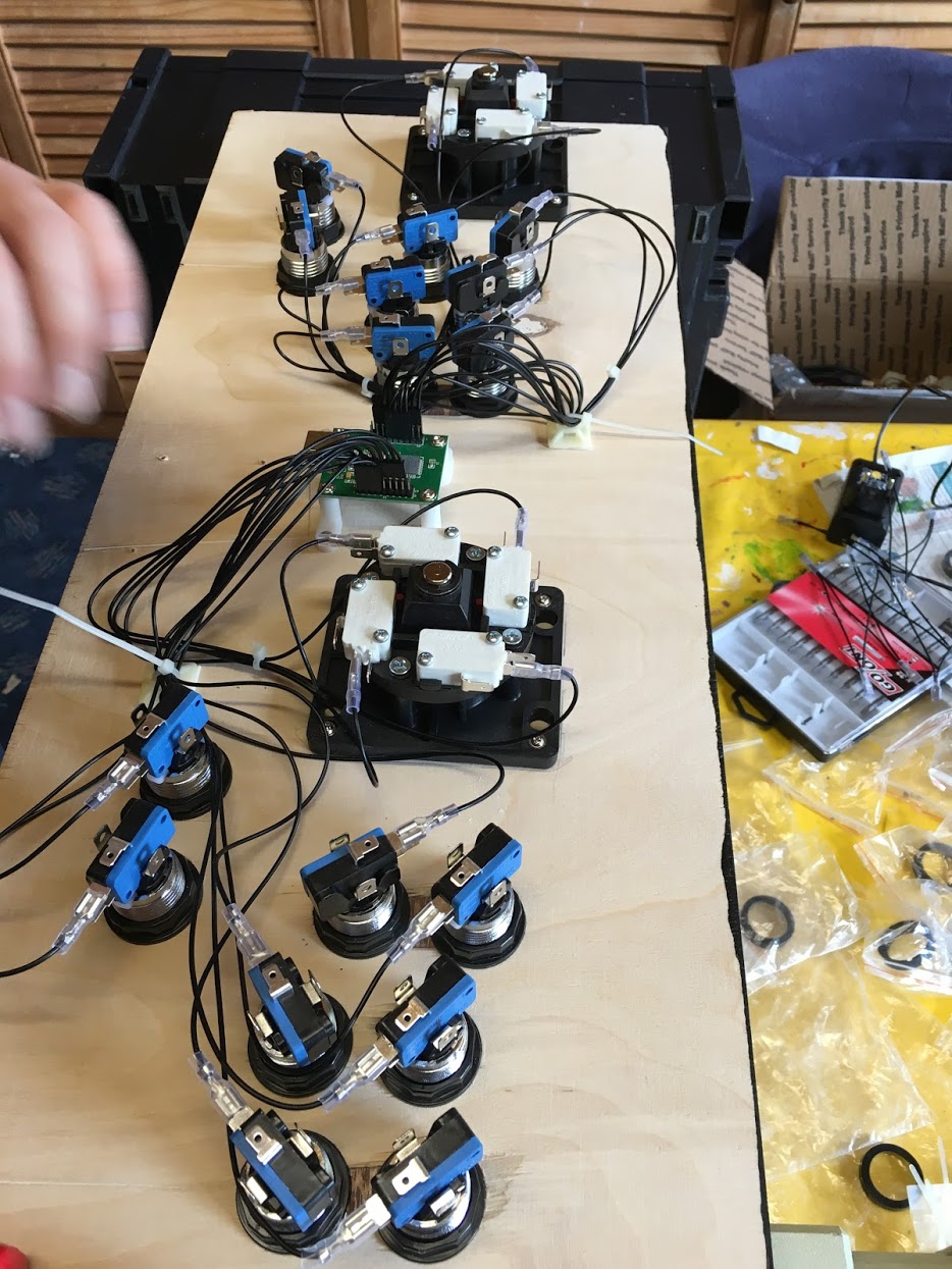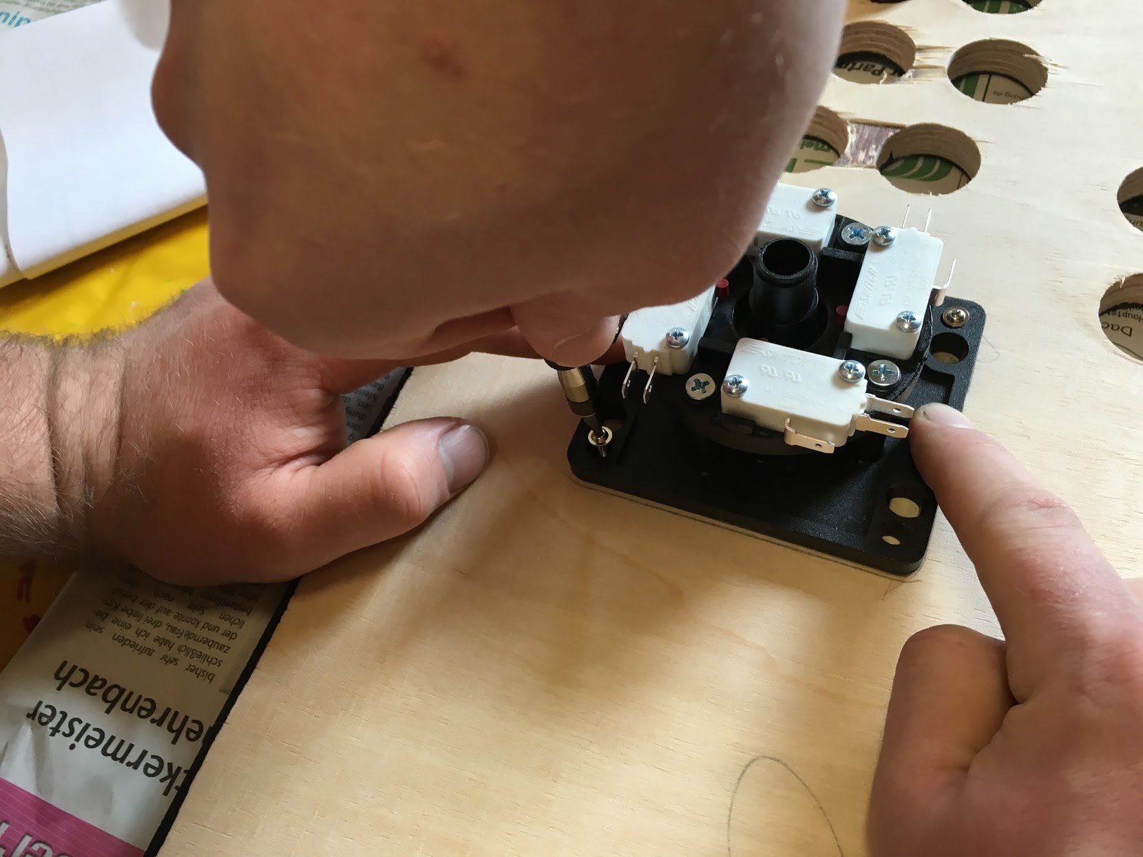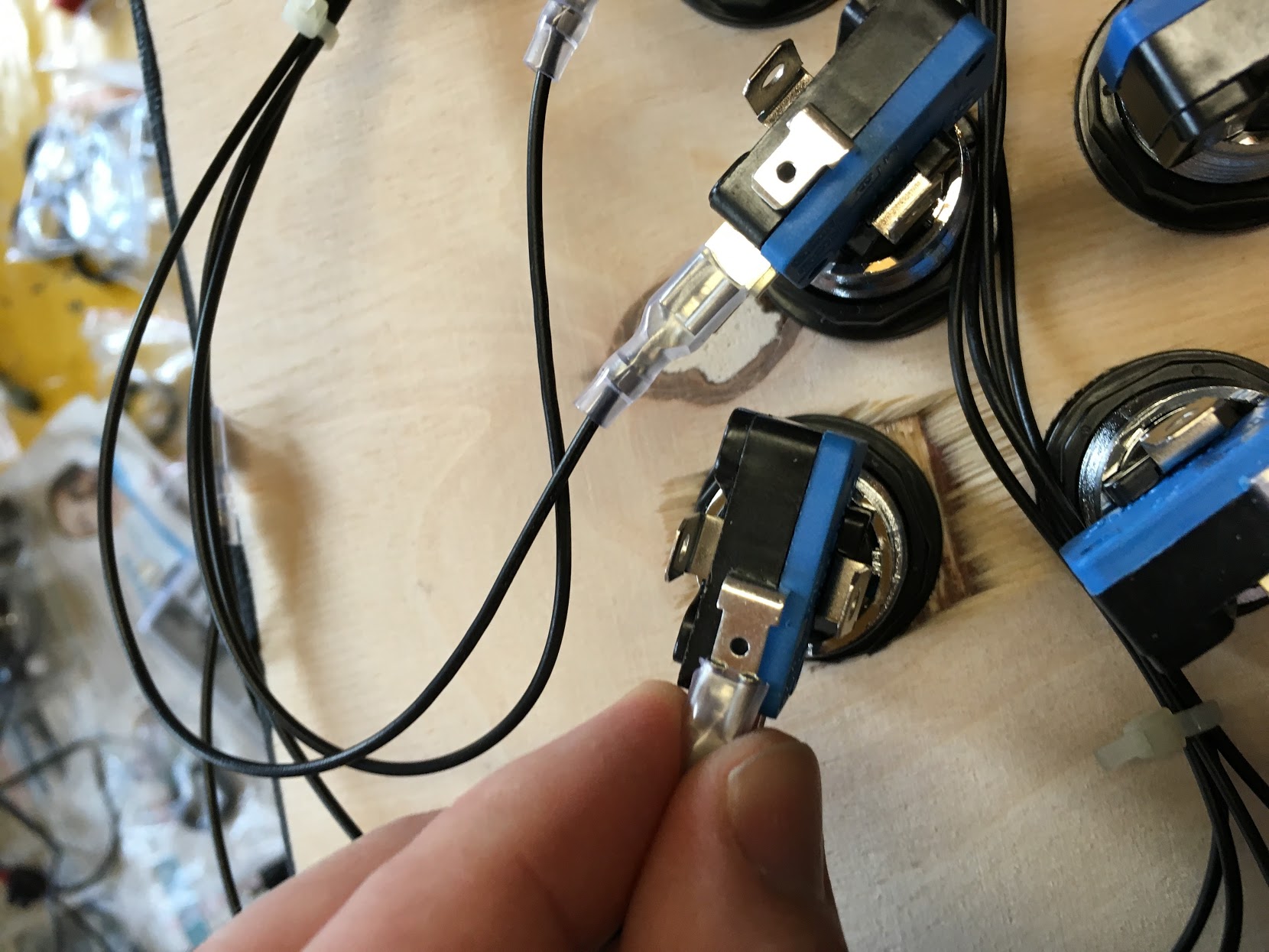 Parallel zu den Holzarbeiten haben wir die Buttons vorbereitet. Während die Kabel zum Anschluss der „Microswitches“ an der Platine mitgeliefert wurden, mussten wir das Kabel für die Stromversorgung der einzelnen Buttons selbst herstellen. Hierfür haben wir ein klassisches 5V Netzteil genommen und das Kabel einfach durchtrennt und mit Endhülsen versehen. An die beiden enthaltenen Adern musste nun jeweils eine 26-gliedrige „Daisy Chain“ angebracht werden (18 Buttons und zwei Joysticks mit je vier Richtungen).