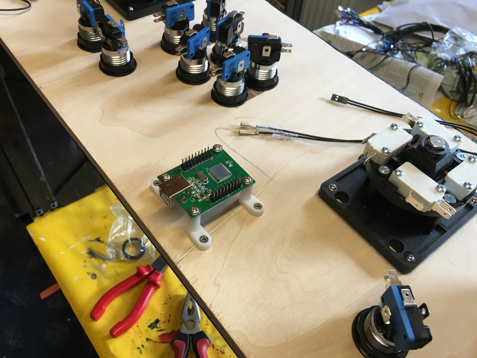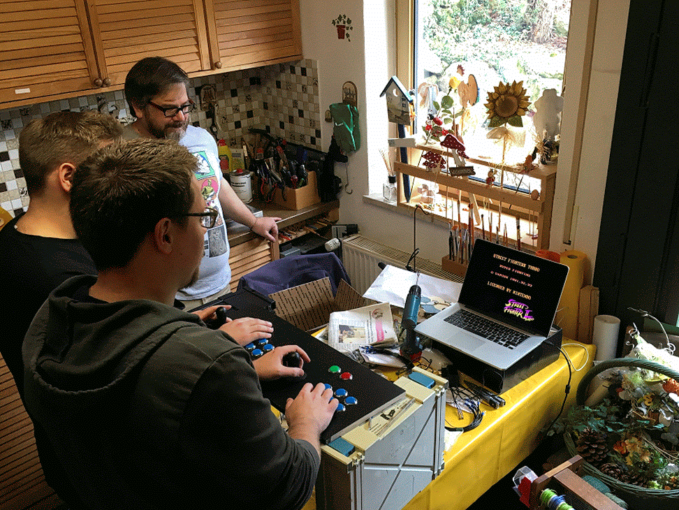 Nun konnten die Buttons und Joysticks angebracht und verkabelt werden. Das Anbringen ist schnell erledigt – das Verkabeln dauert schon eine Weile länger und erfordert gutes Kabelmanagement. Der Anschluss an der Platine ist auf Grund der Anleitung, die der Hersteller per E-Mail zugesandt hat, kein Problem. Zum Test haben wir die Platine per USB an meinem MacBook Pro angeschlossen – die Buttons wurden problemlos erkannt und habe eine kleine Testrunde „Street Fighter 2“ gut verkraftet. (zum Video)