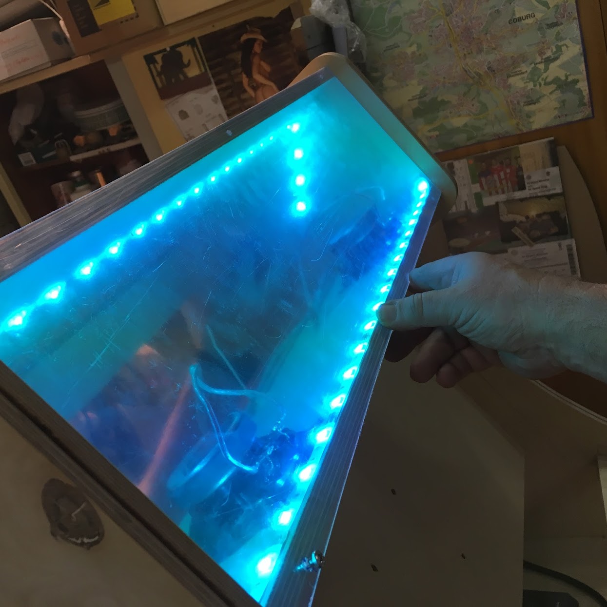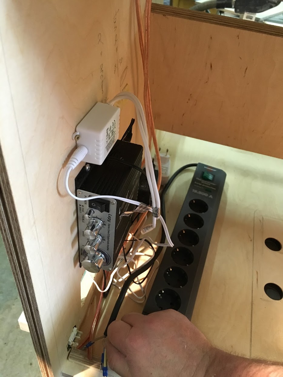 Neben den Buttons, musste noch ein kleiner Verstärker für die Boxen, der Stromanschluss und die integrierte Steckdosenleiste, sowie die LED Lichter für die Beleuchtung der Marquise angebracht werden. Das ist alles relativ simpel und selbsterklärend.