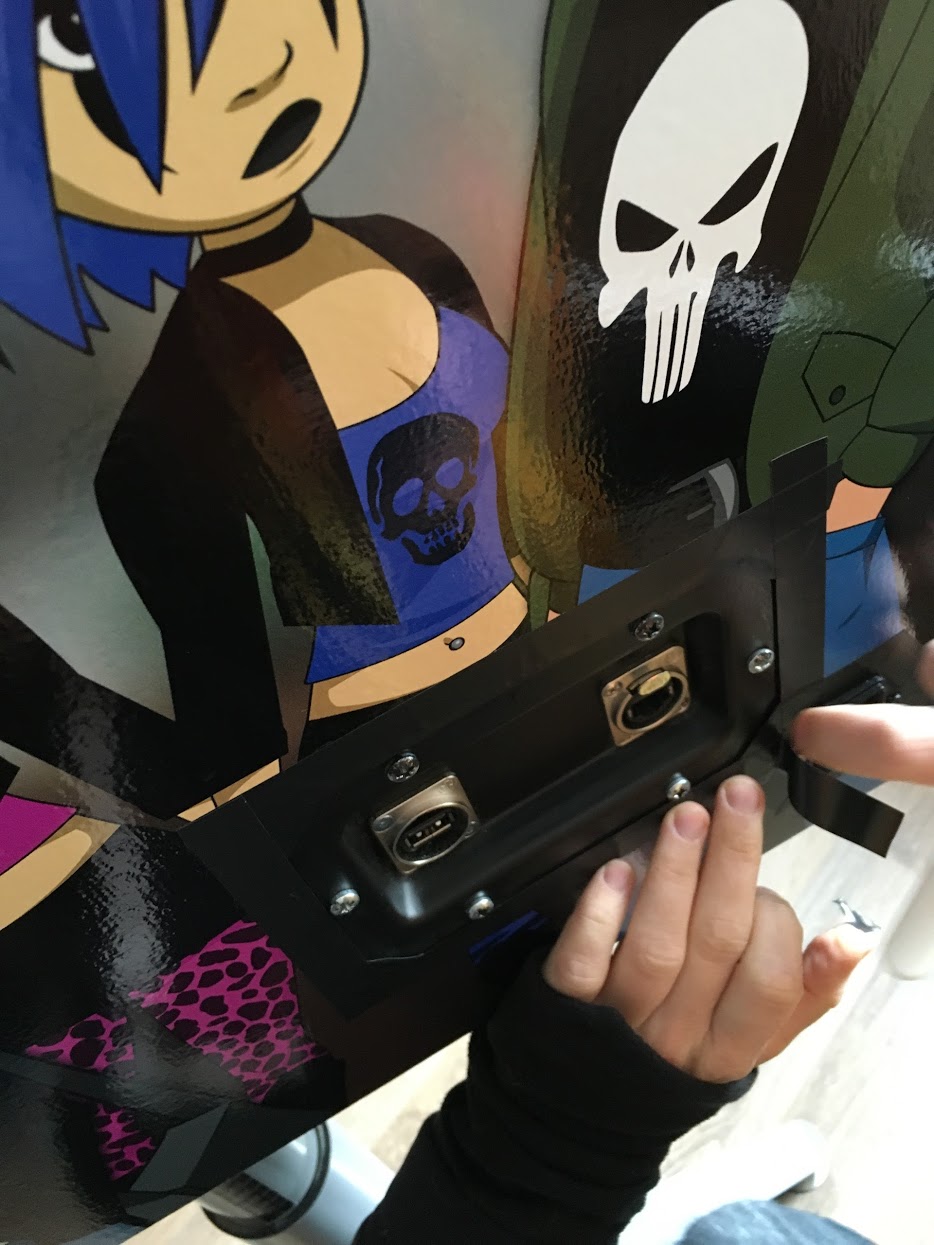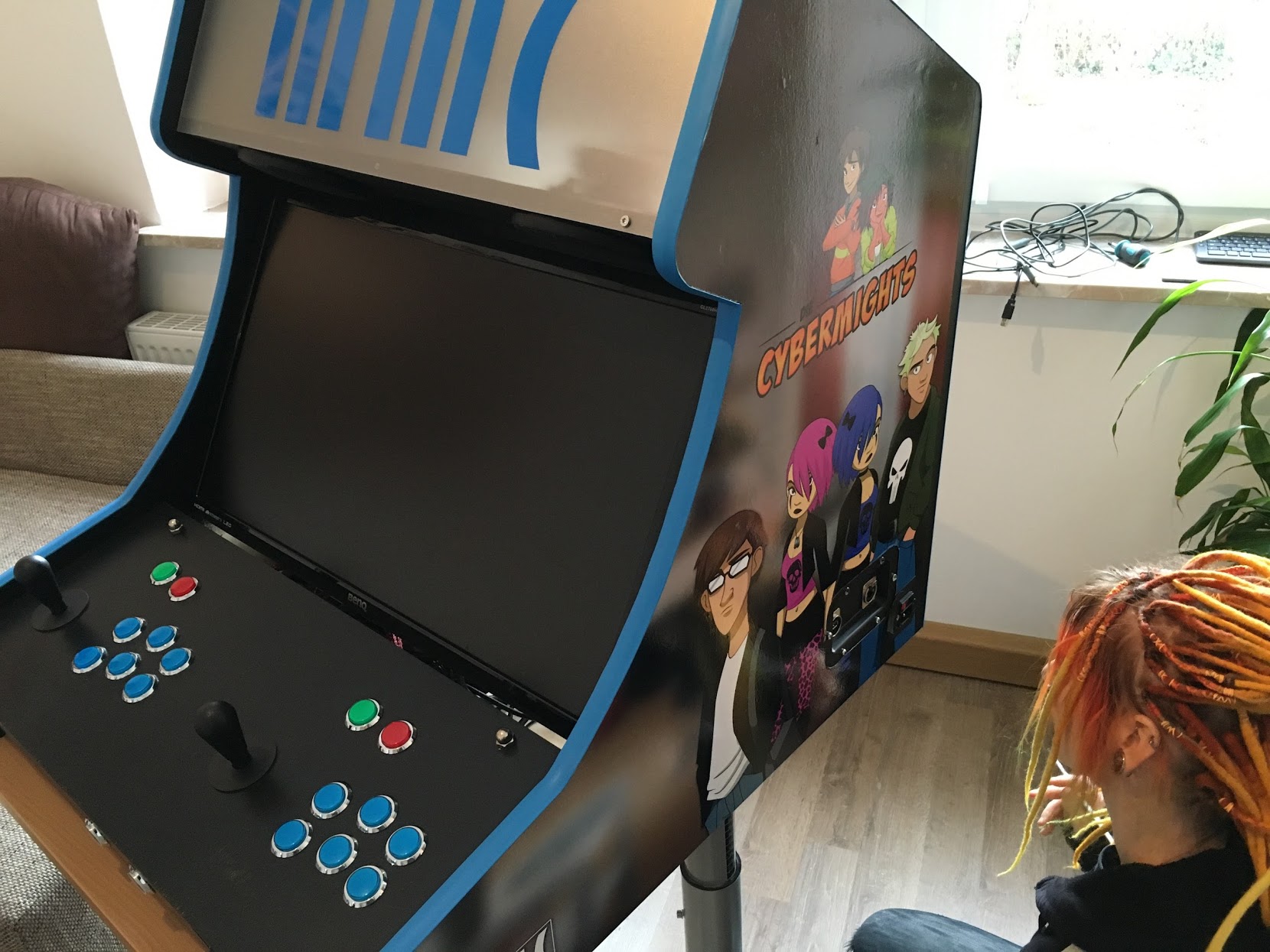 Damit das Ganze auch perfekt an unser neues Spiel „Die Cybermights – Der Fall Ann-Kathrin“ angepasst ist, haben wir für die Seitenwände Folien fertigen lassen und angebracht – das ist eine ganz schöne Fitzelarbeit.