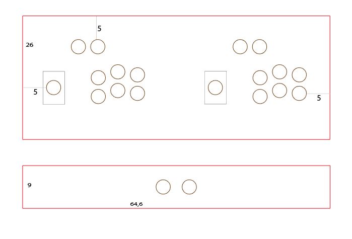 Die Buttons benötigten Lochbohrungen von 30mm Durchmesser – mit den obigen Abmessungen lässt sich so leicht eine Schablone vorbereiten, die später 1zu1 ausgedruckt und als Vorlage für die Bohrungen verwendet wird. Ich bevorzuge eine eine leicht versetze Anordnung der Buttons. Wollen wir später eine Plexiglasabdeckung für das Controlboard fertigen, können wir ebenfalls diese Vorlage verwenden.