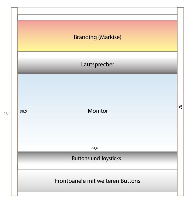 In dieser Grafik habe ich die Werte erstmal sehr genau abgemessen – ich denke für den finalen Zuschnitt werden wir die Längen runden. In der Breite addieren wir auf die 64cm des Bildschirms noch ein paar Millimeter Spielraum und können so auch eine Vorderansicht und das Controlboard mit Buttons und Joysticks vorbereiten.