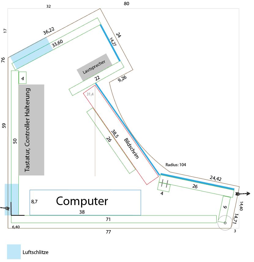Rot eingezeichnet ist der Bildschirm. Da er etwas größer ist und auch aus einiger Entfernung besser zu erkennen sein soll, haben wir die Neigung im Vergleich zu üblichen Arcades etwas reduziert. Der Bildschirm ist inklusive Gehäuse 38,5cm hoch und 72cm breit. Damit sind die meisten Größen bereits vorgegeben. Damit das Silverstone Gehäuse (dünner blauer Rahmen) mit seinen 38cm Seitenmaß noch hinein passt, musste der hintere Bereich etwas großräumiger gestaltet werden – dafür hat er so auch noch etwas Raum für die Abluft (wobei die verbauten Komponenten keine allzu hohe Abwärme erzeugen sollten).