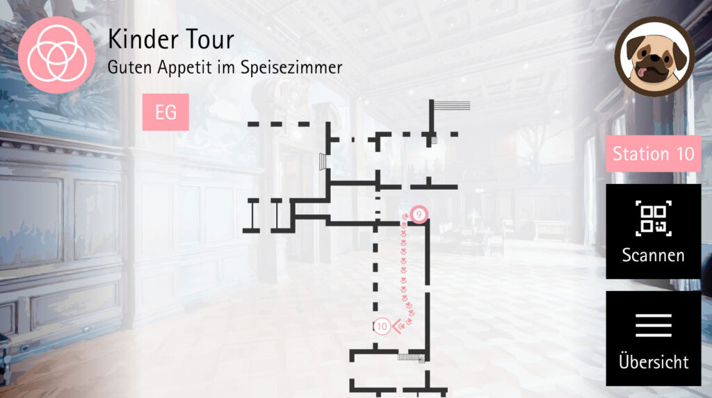 Für Kinder haben wir ein HTML-Spiel entwickelt, bei dem sie liebevoll gezeichneten Charakteren (z. B. Hund Findus) dabei helfen, einen Schatz zu finden und das Geheimnis rund um einen Geisterhund zu lüften, der in der Villa Hügel lebt. In verschiedenen Stationen in der Villa Hügel sowie im angrenzenden Hügelpark müssen die Kinder Aufgaben lösen, um dem Rätsel auf die Spur zu kommen. Nebenbei erfahren Sie Wissenswertes über die Geschichte der Villa Hügel und ihrer früheren Bewohner. Bei einem Fehler-Such-Spiel müssen Sie beispielsweise die realen Wandteppiche mit den Abbildungen in der App vergleichen. Schiebepuzzle sowie Reaction Games wie „Porzellan auffangen“ (Station Küche), „Töne nachspielen“ (Station Orgel), erhöhen die Motivation und sind thematisch in die Stationen eingebunden.